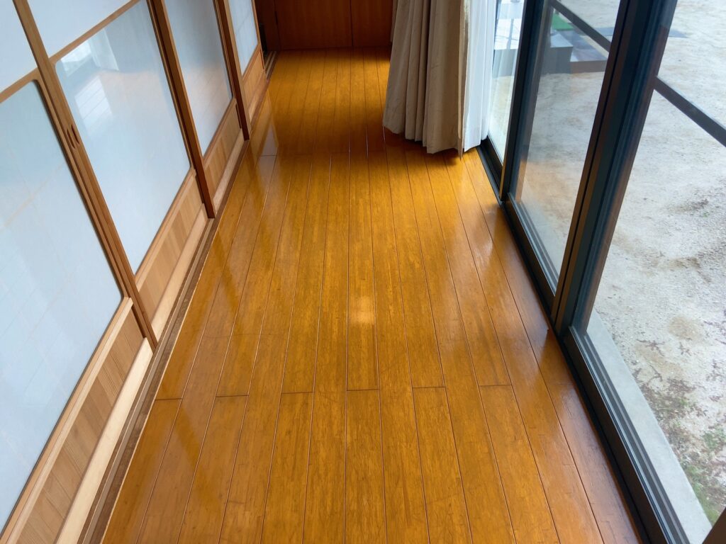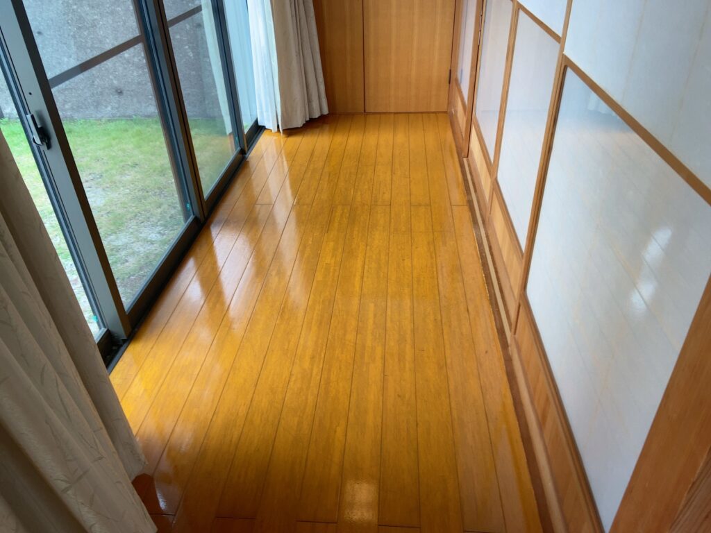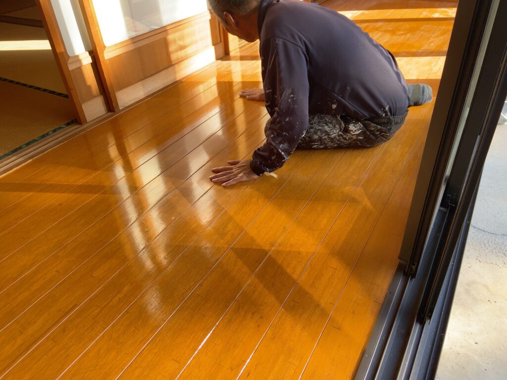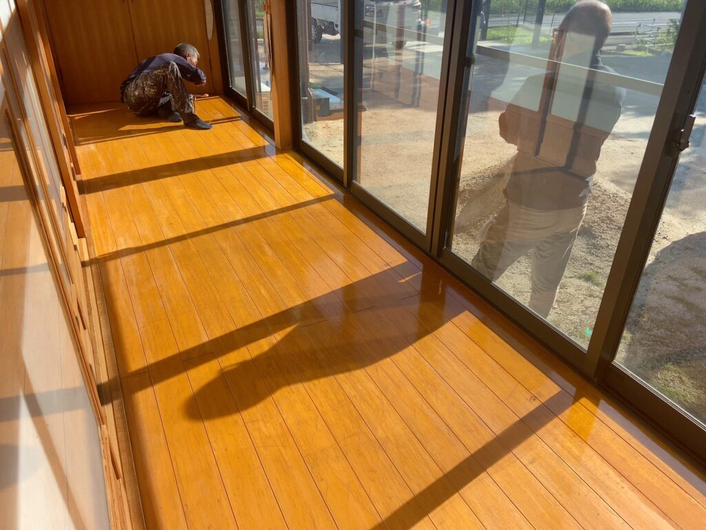 玄関と広縁の床表面のキズ 塗料はがれの補修の相談をしてもらいました。 リフォーム 2026.02.20 玄関と広縁の床表面のキズ、塗料はがれの補修の相談をしてもらいました。表面をペーパーがけしてクリアー塗装しました。艶がでて仕上がりました。ありがとうございました! #床補修