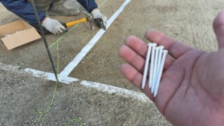 テニスコートのラインひき直しを頼んでいただきました。既存のラインテープが古くなって切れてはずれてる部分があります。新しいラインテープを専用釘で打ちつけます。釘の数の多さがすごかったです。これでテニスコート利用者さんにしっかり練習してもらえま...